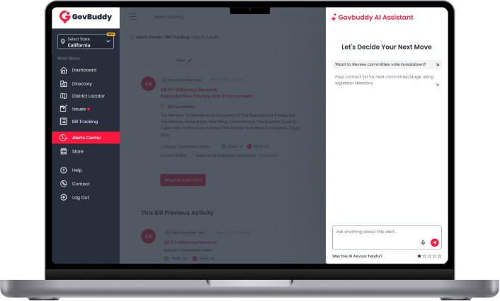 Bill tracking alerts, committee meeting insights, and AI guidance on best practices for achieving results